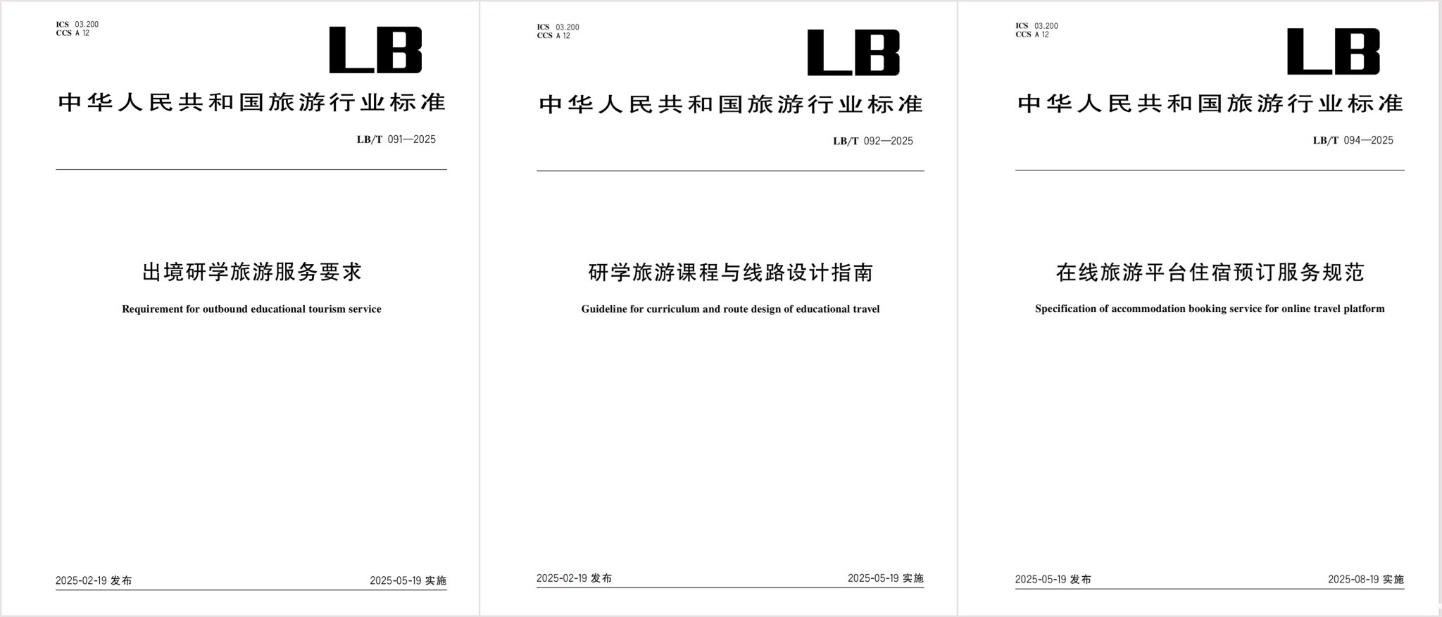 近日,学校牵头制定的《出境研学旅游服务要求》(LB/T 091-2025)、《研学旅游课程与线路设计指南》(LB/T 092-2025)、《在线旅游平台住宿预订服务规范》(LB/T 094-2025)等3项旅游行业标准,由文化和旅游部正式发布。截至目前,学校牵头制定并发布的行业标准已达8项,参与起草并发布的行业标准2项,在研行业标准6项。