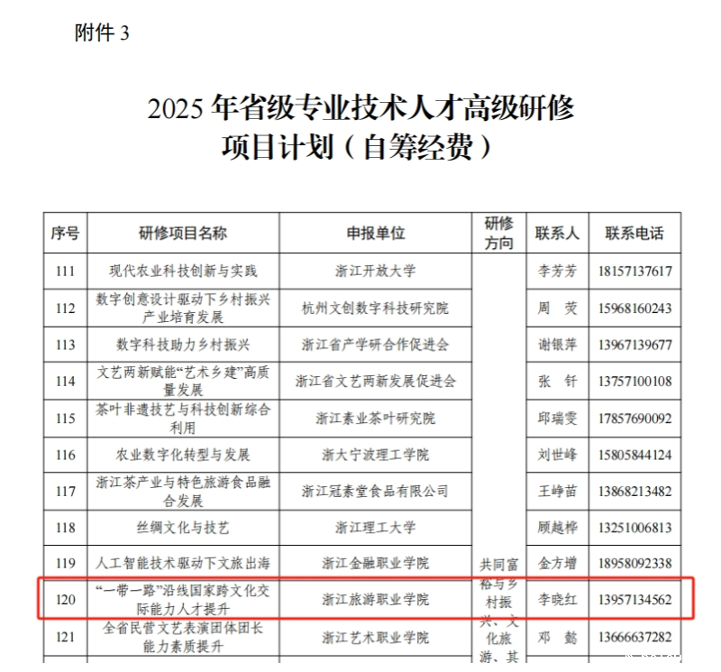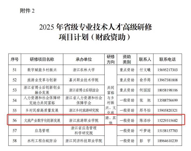 近日,浙江省人力资源和社会保障厅公布了2025年度国家级和省级专业技术人才高级研修项目评审结果,我校申报的《文旅产业数字化创新发展》《“一带一路”沿线国家跨文化交际能力人才提升》等2个项目成功获批。
